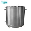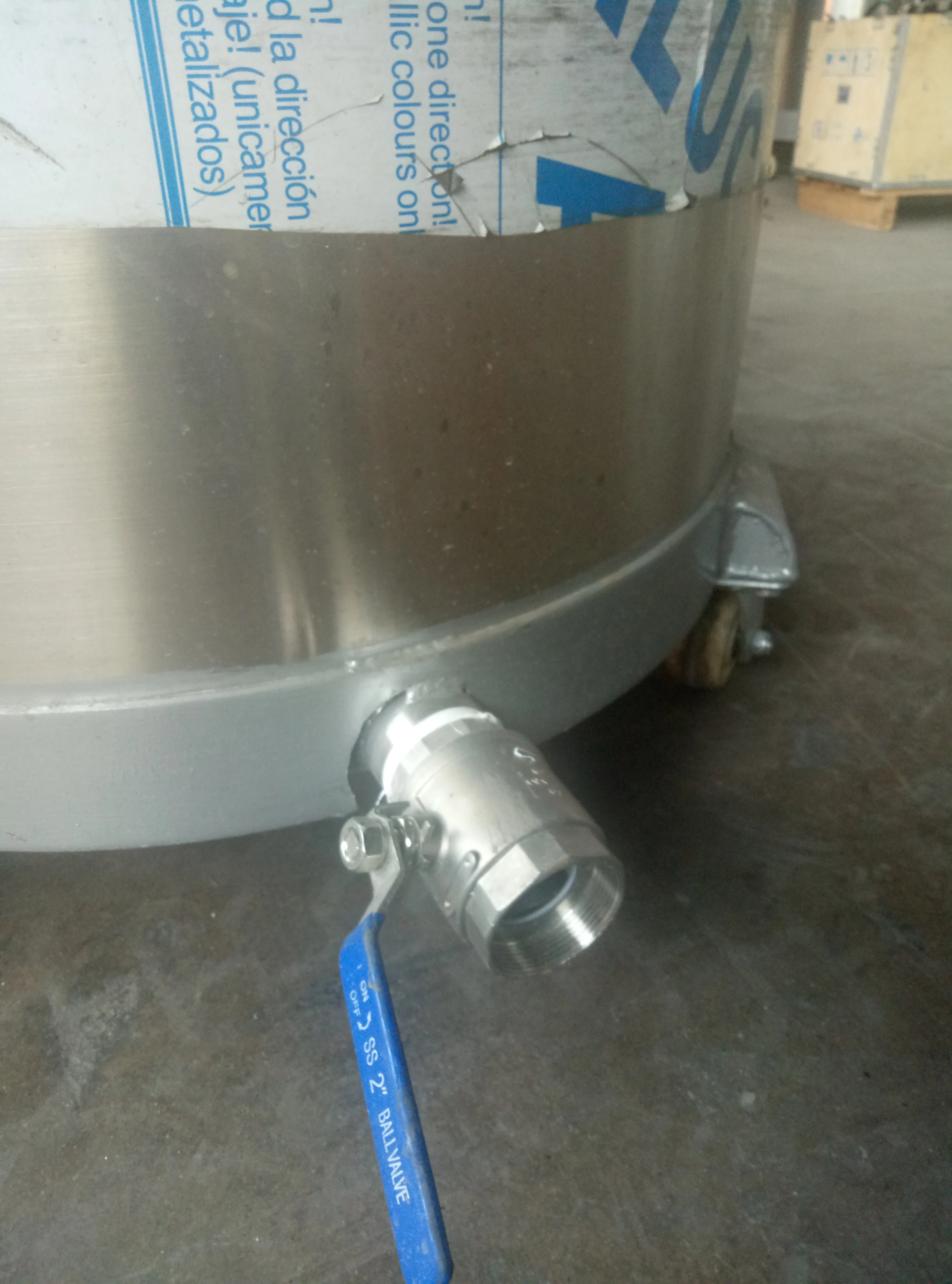 It can be made of stainless steel 201 and 304, polished inside and outside, convenient side discharging, specially designed bottom surface, clean discharging, industrial caster, smooth and stable handle, upper and lower reinforcing hoops on the barrel body, and mesh of reinforcing ribs at the bottom of more than 1 000. Excellent welding process, corrosion resistance, oxidation resistance, discharge port 1.5 inch or 2 inch. The volume can be selected according to the demand.
