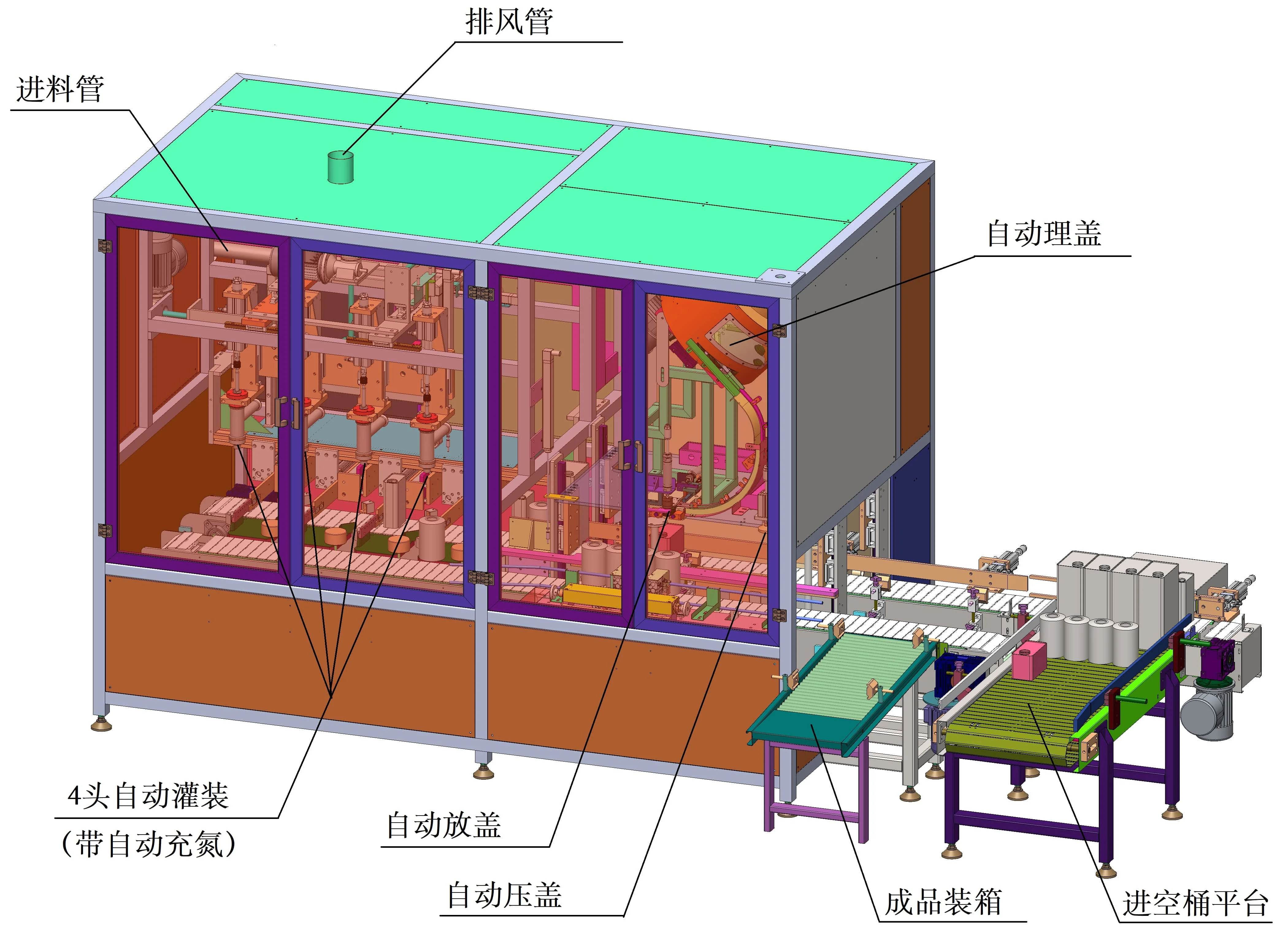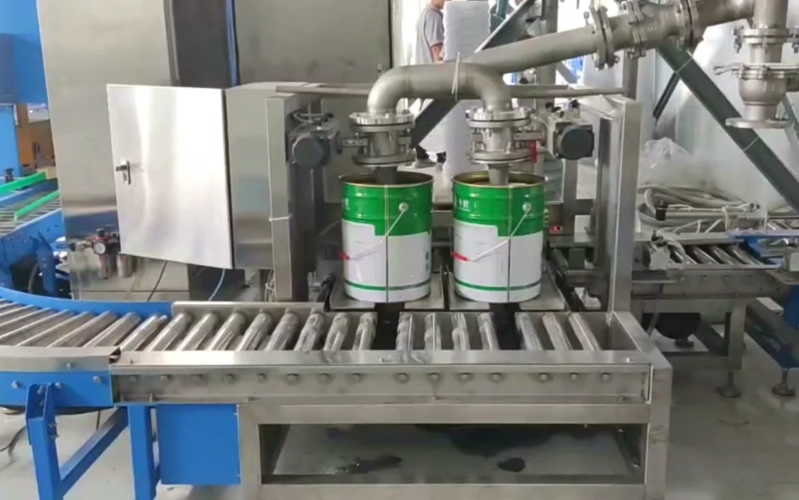 The fully automatic paint filling line is an integrated electromechanical product in a fully enclosed system. Under electrical control, the mechanical equipment performs automatic barrel loading, quantitative filling, capping, inspection, pallet