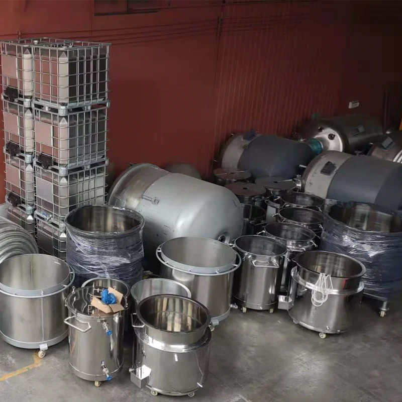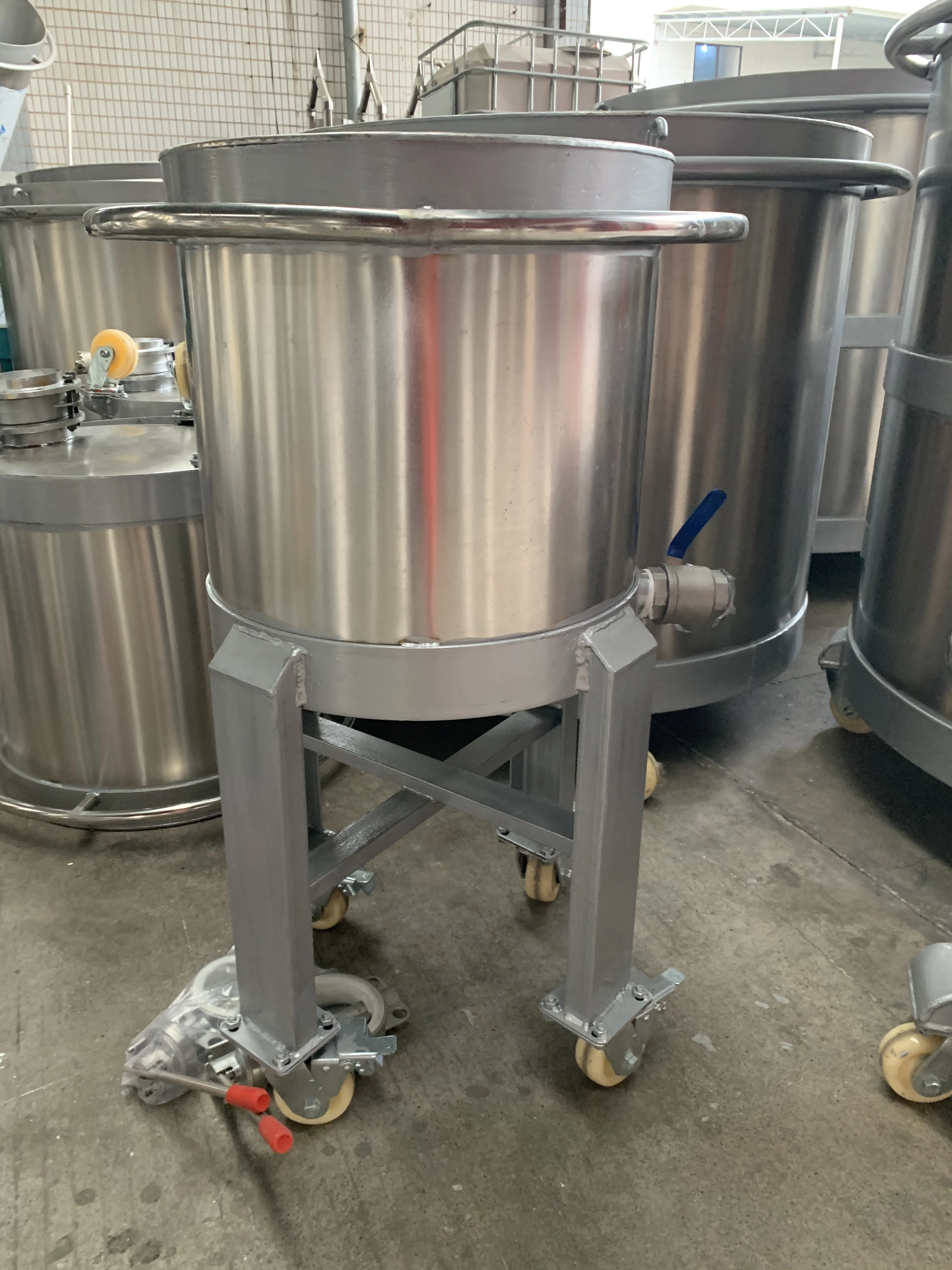 It can be made of stainless steel 201 and 304, polished inside and outside, convenient side discharging, specially designed bottom surface, clean discharging, industrial caster, smooth and stable handle, upper and lower reinforcing hoops on the barrel body, and mesh of reinforcing ribs at the bottom of more than 1 000. Excellent welding process, corrosion resistance, oxidation resistance, discharge port 1.5 inch or 2 inch. The volume can be selected according to the demand.