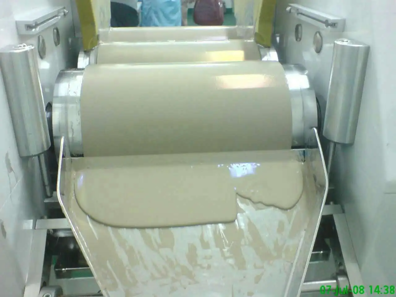 The material to be milled is placed between the feed and center rolls. Each adjacent roll rotates at progressively higher speeds. For example; the feed roll may rotate at 26 rpm, the center roll at 70 rpm and the apron roll at 145 rpm. Material is transferred from the center roll to the apron roll by adhesion. The dispersion is achieved by the shear forces generated between the adjacent rolls. The milled material is removed from the apron roll by a knife that runs against the roll.