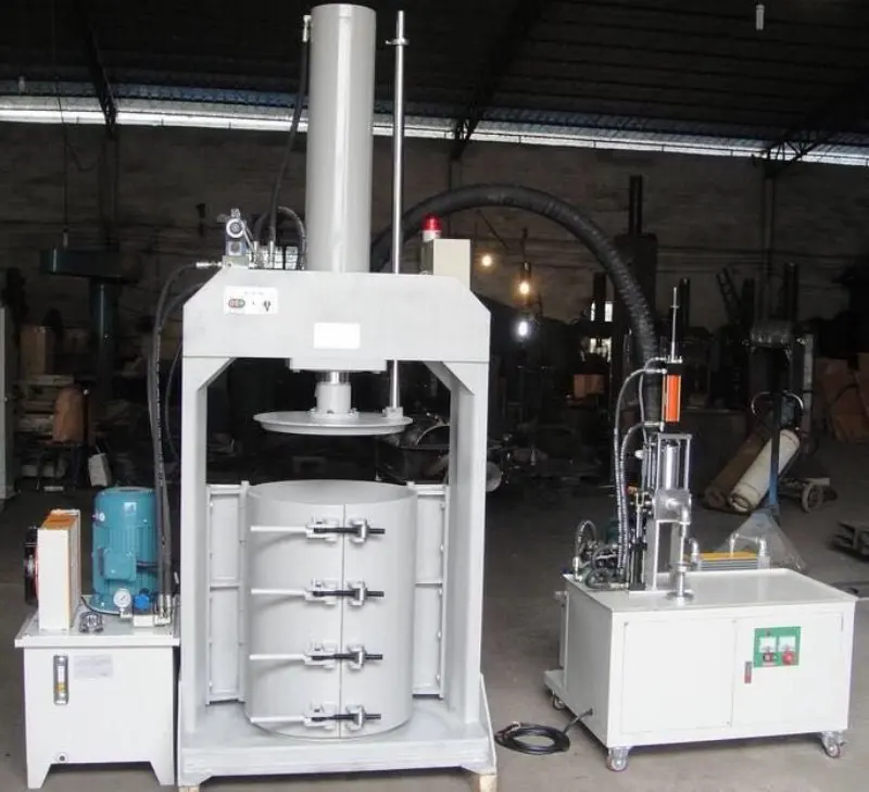 Hydraulic pressing machine is a hydraulic equipment matched with mixer, it is for pressing materials with viscosity. It features